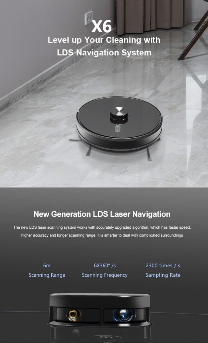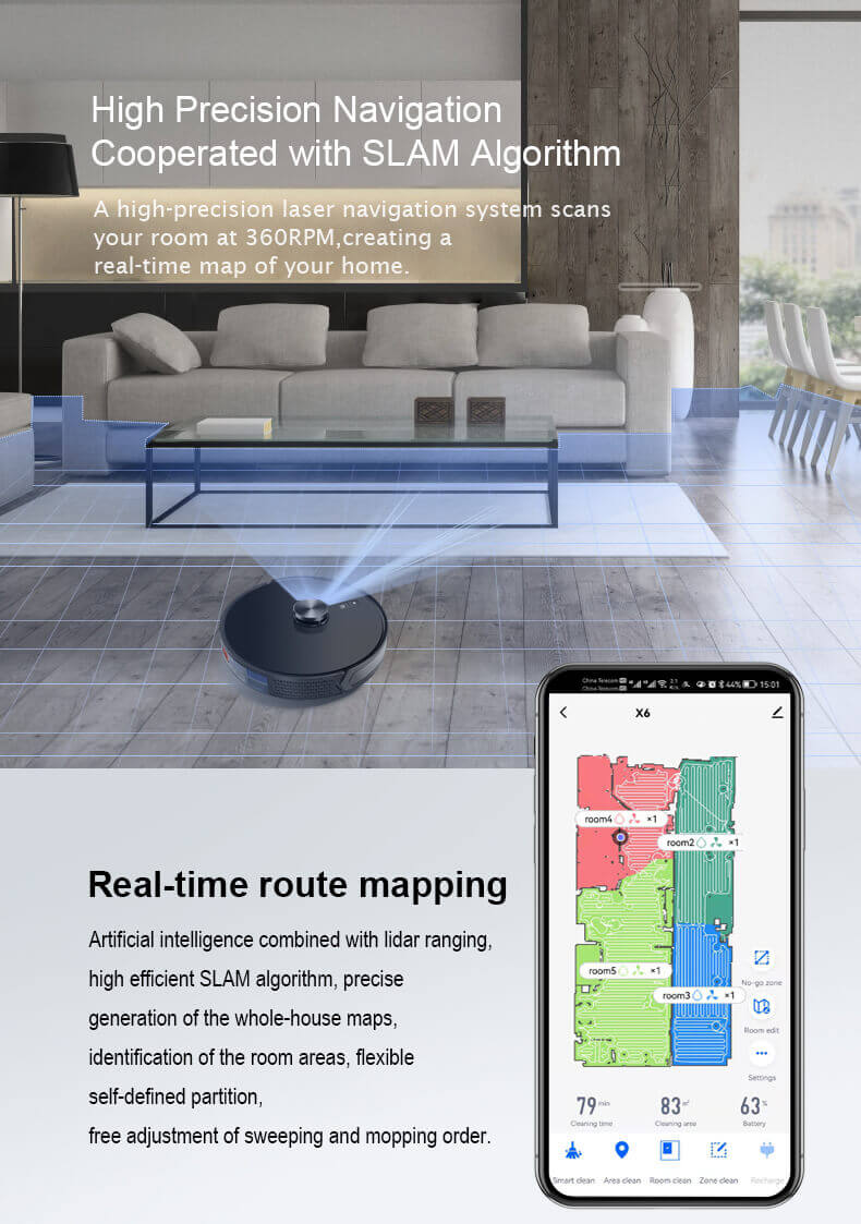 Navigazione LIDAR di Precisione: Grazie alla tecnologia avanzata Light Detection and Ranging (LIDAR), il robot aspirapolvere X6 scansiona l’ambiente e crea mappe estremamente dettagliate della tua casa. Le mappe possono essere suddivise in diverse zone, permettendoti di selezionare facilmente le aree specifiche da pulire, sia per aspirare che per lavare. Questa navigazione intelligente garantisce una pulizia efficace e accurata, evitando ostacoli e ottimizzando il percorso.
